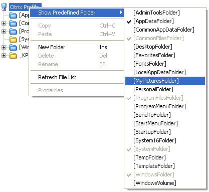 In the Citrix Profile tree, select the Citrix Profile node (or any of the files or folders that are listed, point to Show Predefined Folder. A list of predefined folders opens.