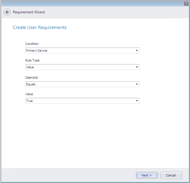 | Condition | Select a condition type from the list. For user requirements, Primary Device is the only condition type listed. |