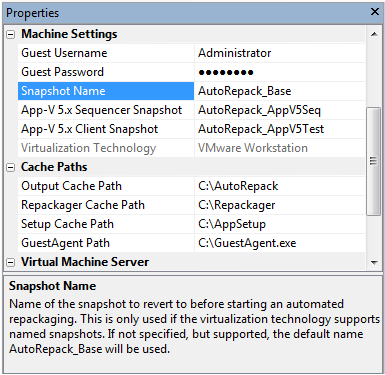 If you assign a snapshot name other than AutoRepack_Base, after you add the virtual machine to the Automated Application Converter, you need to enter that snapshot name in the Snapshot Name field in the Properties window of the Machines tab for that virtual machine.