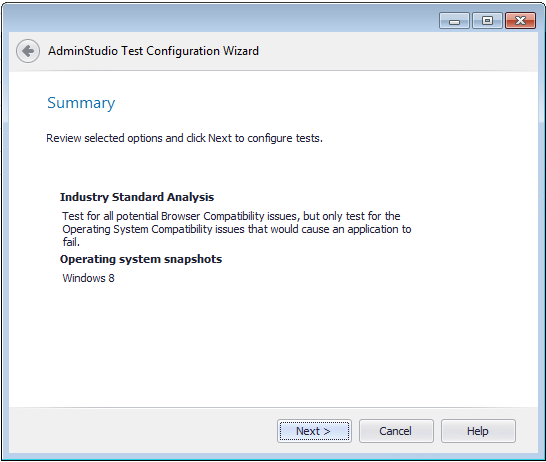 The Summary panel of the AdminStudio Test Configuration Wizard, which is opened by clicking Test Configuration Wizard on the Select Tests to Execute dialog box, lists a summary of the selections you have made in the wizard.