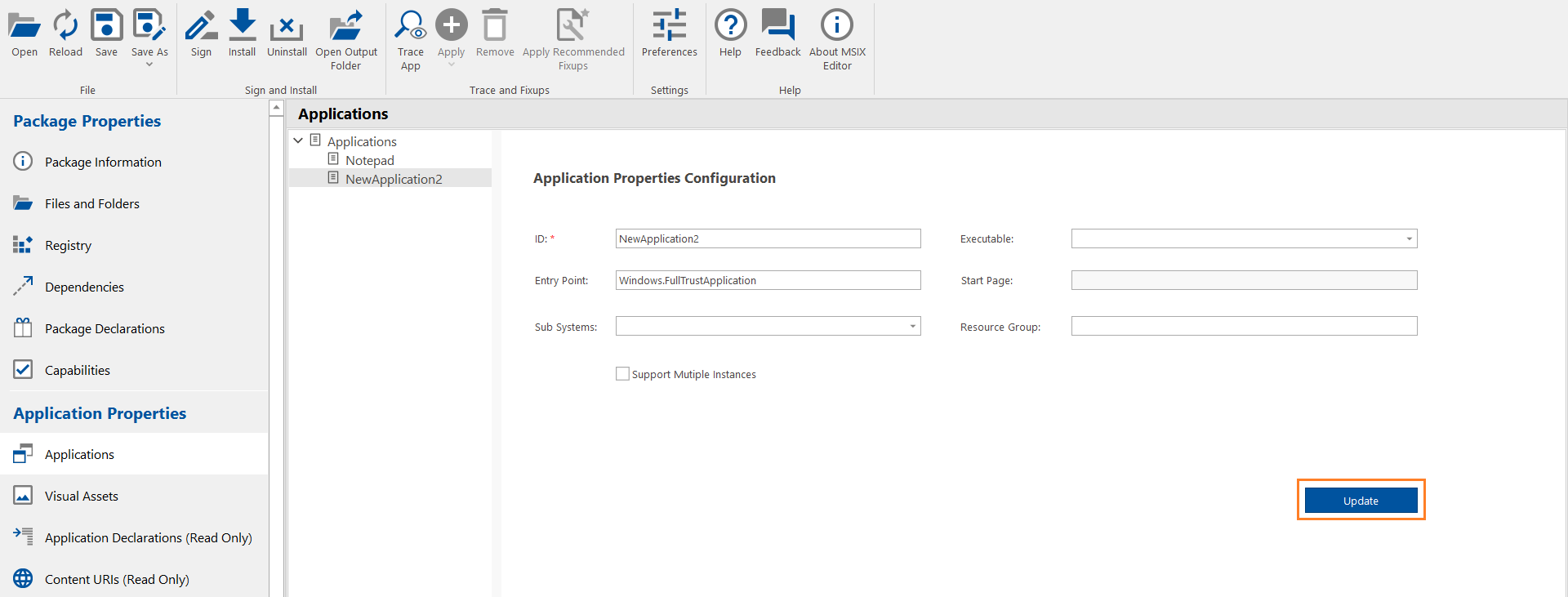 3. Enter the details in the respective fields and then click the Update button. For more information on Applications properties, see Applications View.