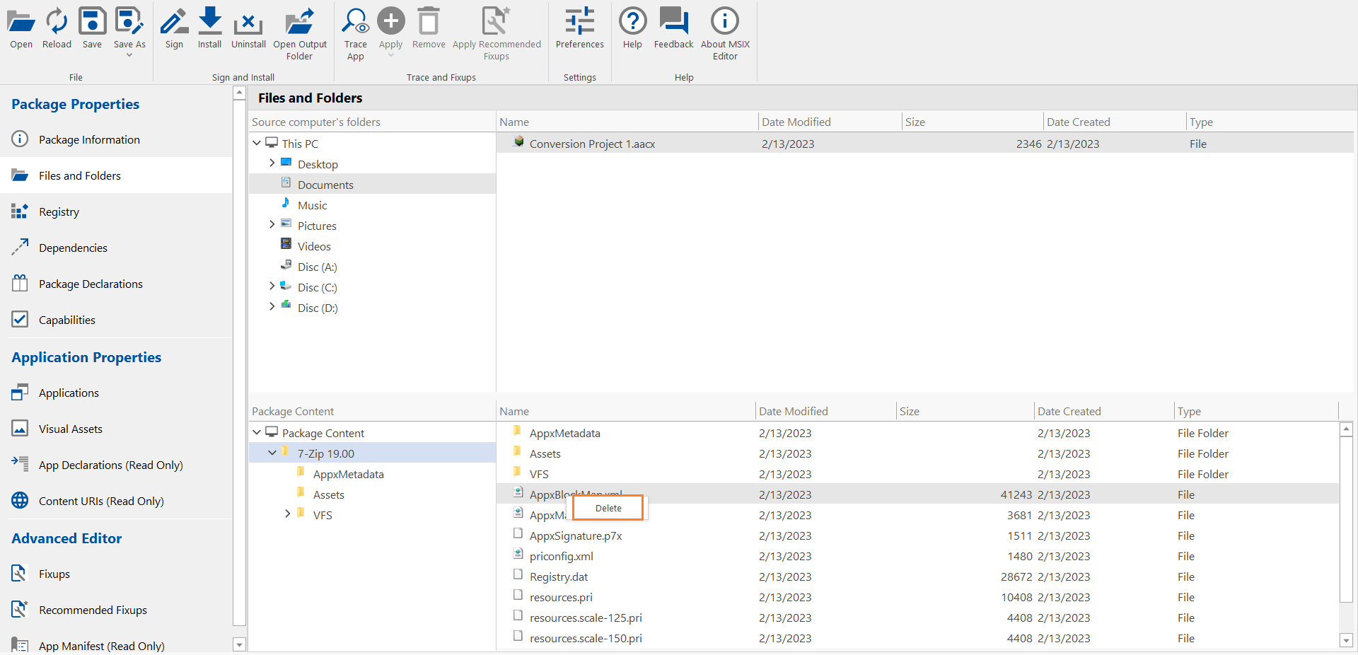 The Files and Folders view of the MSIX Editor lets you delete a file or folder to your MSIX package.