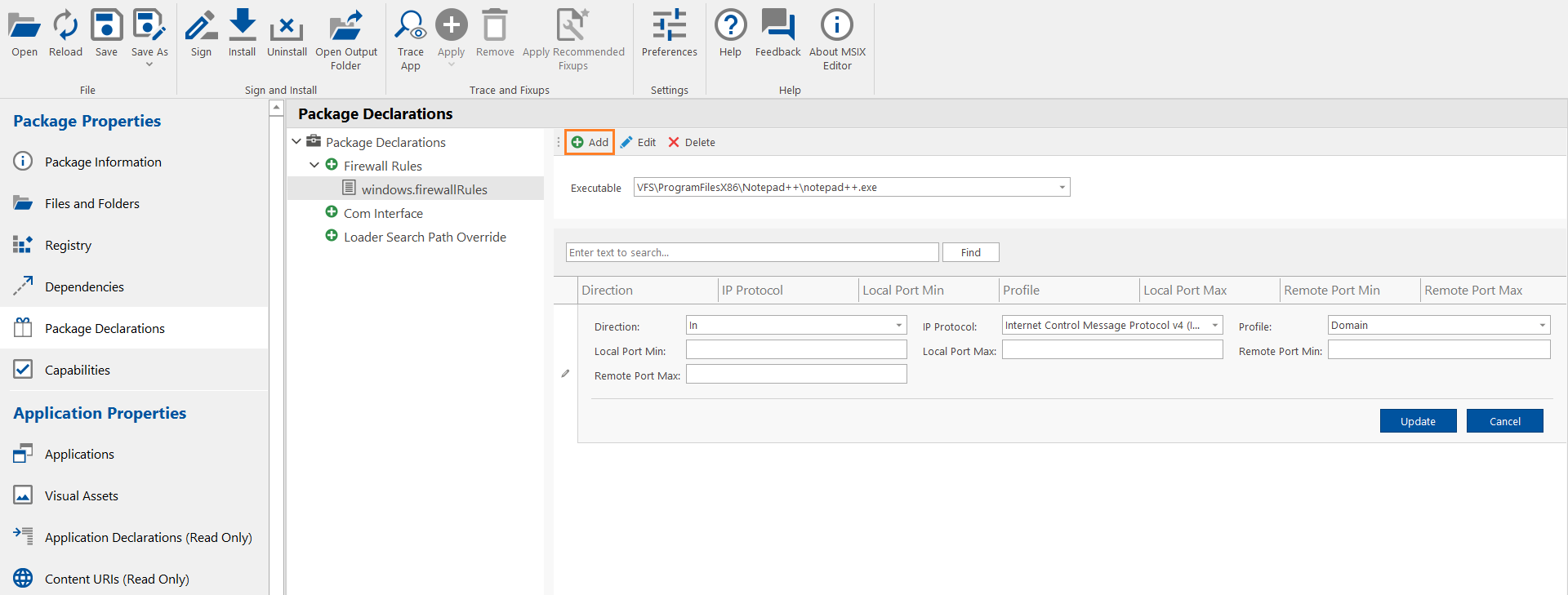 In the Package Declarations pane, right-click on any declaration where you want to add properties, and then click on Add Rule as appropriate.