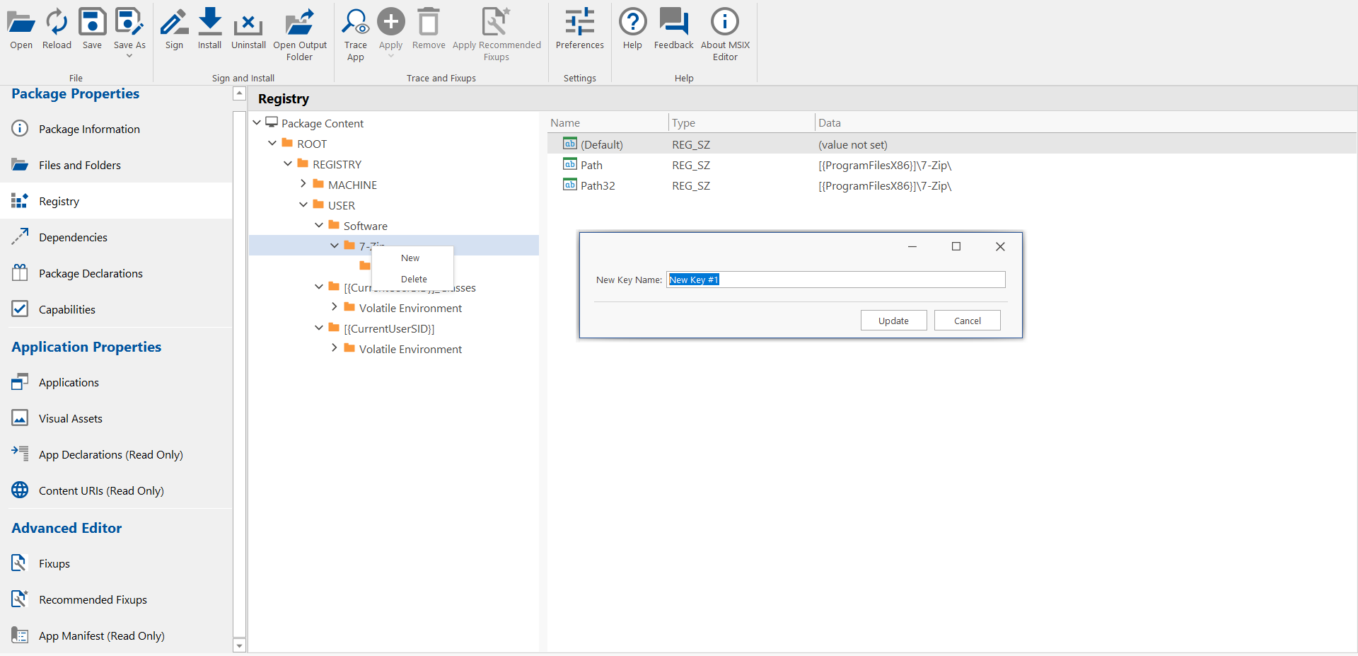 Upon saving, the new registry key will be added to the selected MSIX package.