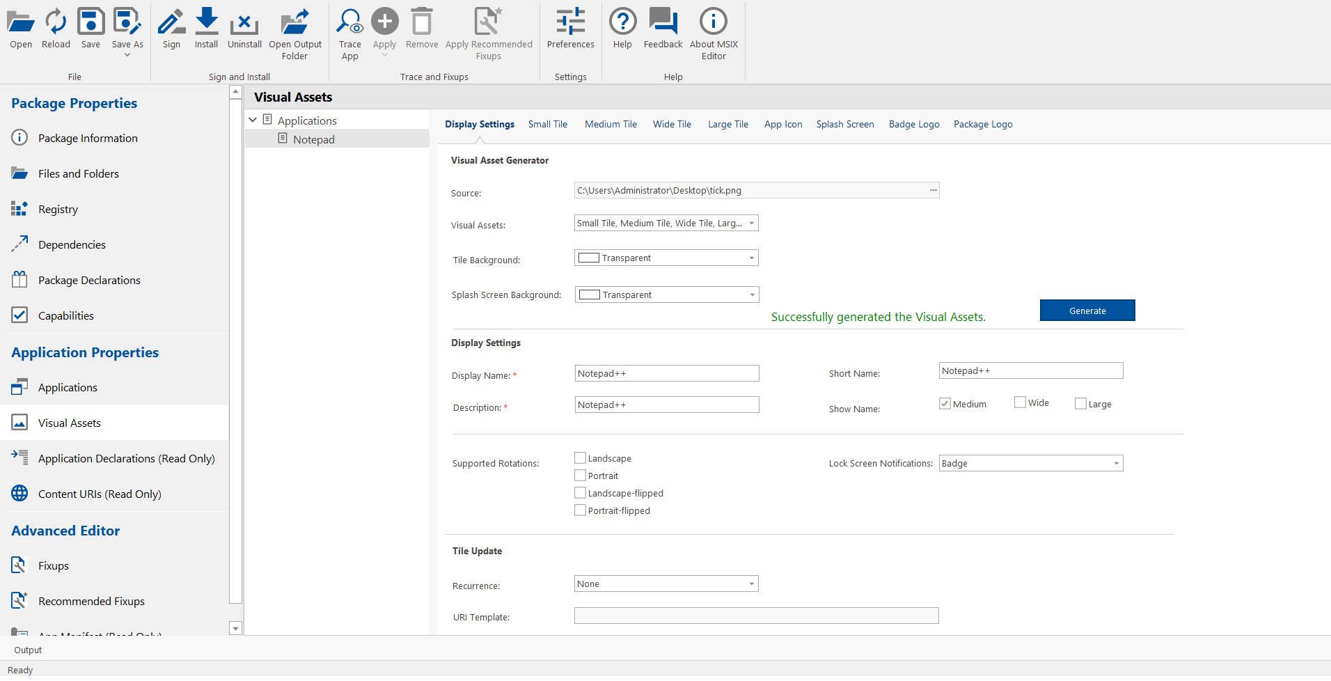 Upon successful action, selected visual assets are generated. The following message will be displayed on the page.